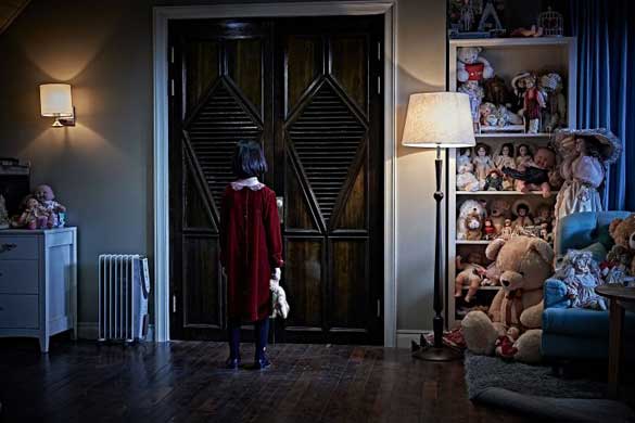 My use of the word “familiar” is not a criticism in this case. The reason being that scenes such as these work like a charm in virtually any horror concept to unsettle within beauty and (seeming) peace prior to darkness taking centre stage, whether, in the case of The Closet, we’re talking about a drive through beautiful countryside surroundings interrupted by ravens eating the entrails of a road-killed deer; birds attracted and crashing to a bloody end on the window of the sumptuous mansion; disembodied voices, stamping footprints, crashes and bangs and even cacophonous, scratchy, out of tune music seemingly coming from an ultimately quiet room with only a quiet, sleeping girl inside; or indeed the early ‘jump scare’ appearances of ghostly figures and screaming, shall we say, entities; etc.